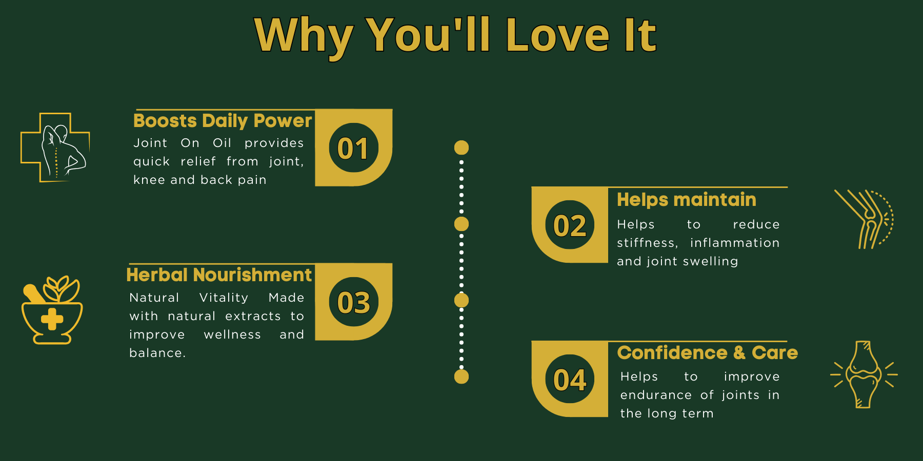 Joint Ease Oil helps relieve knee, joint, back, neck, and arthritis pain, as well as muscle strains, sprains, and sports injuries. It also reduces general body stiffness and fatigue.